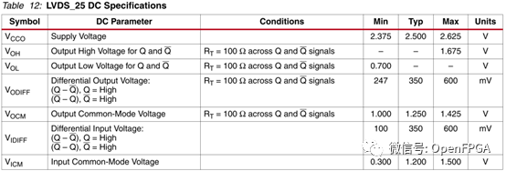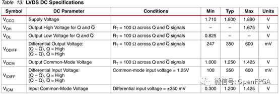 判断的根本原因。当LVDS作为输入引脚时,判断是否可以使用的第二条原则就是对比信号输入与Xilinx相关器件的LVDS的共模电压以及峰峰值的指标是否满足。例如Kintex系列的器件需要查阅DS182中的相关参数,如下图所示。