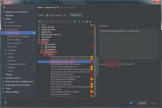 针对第一种原因,解决办法是:降低Autowired检测的级别,将Severity的级别由之前的error改成warning或其它可以忽略的级别。