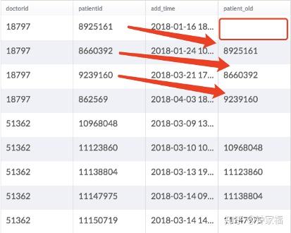 Lag(patientid, 1) over(partition by doctorid order by add_time) patient_bf