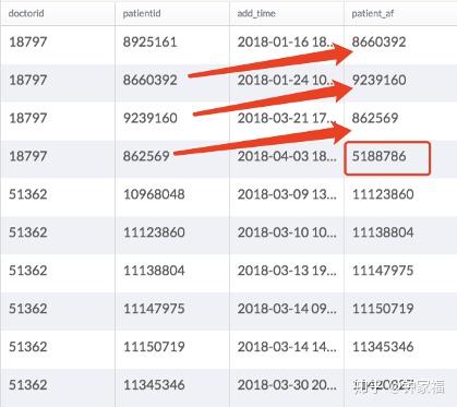 Lead(patientid, 1, 5188786) over(partition by doctorid order by add_time) patient_af