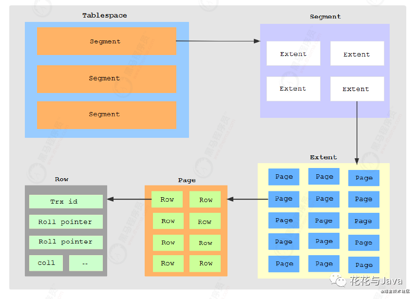 表空间是由各个段组成的,常见的段有数据段、索引段、回滚段等。InnoDB存储引擎是基于索引组织 的,因此数据即是索引,索引即数据。数据段就是B+树的叶子节点, 索引段即为B+树的非叶子节点。InnoDB中对于段的管理,都是引擎自身完成,不需要人为对其控制。