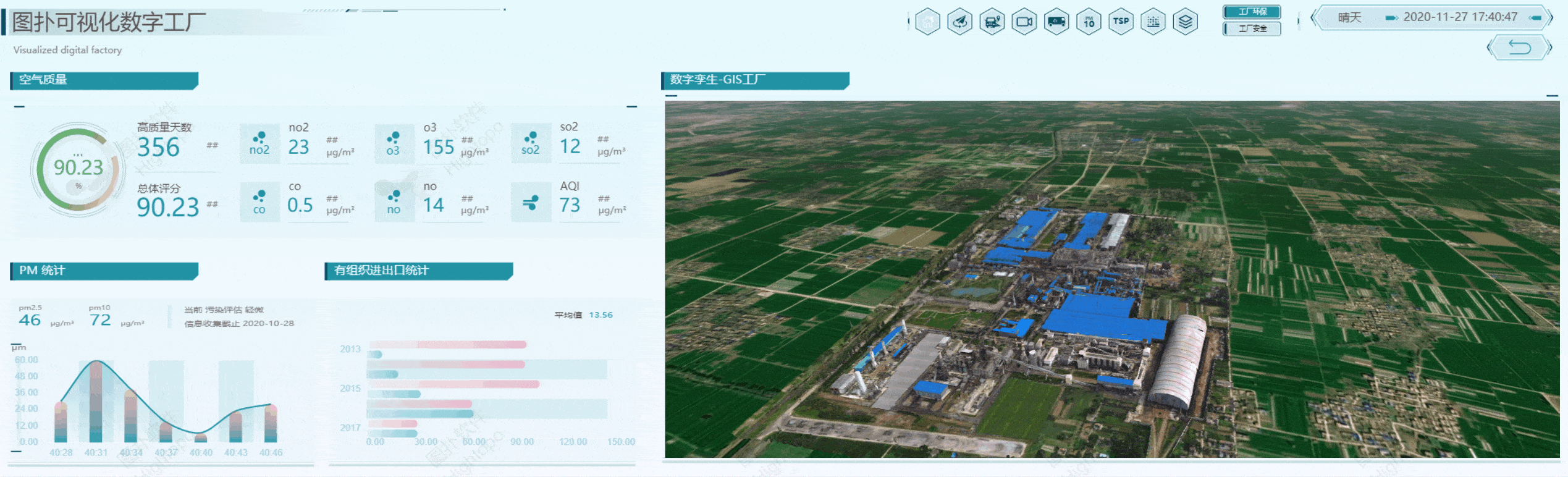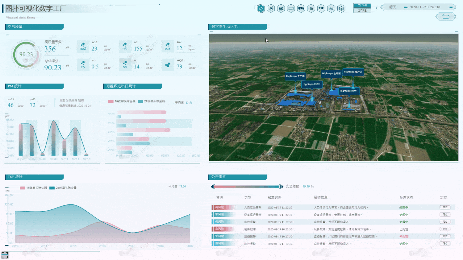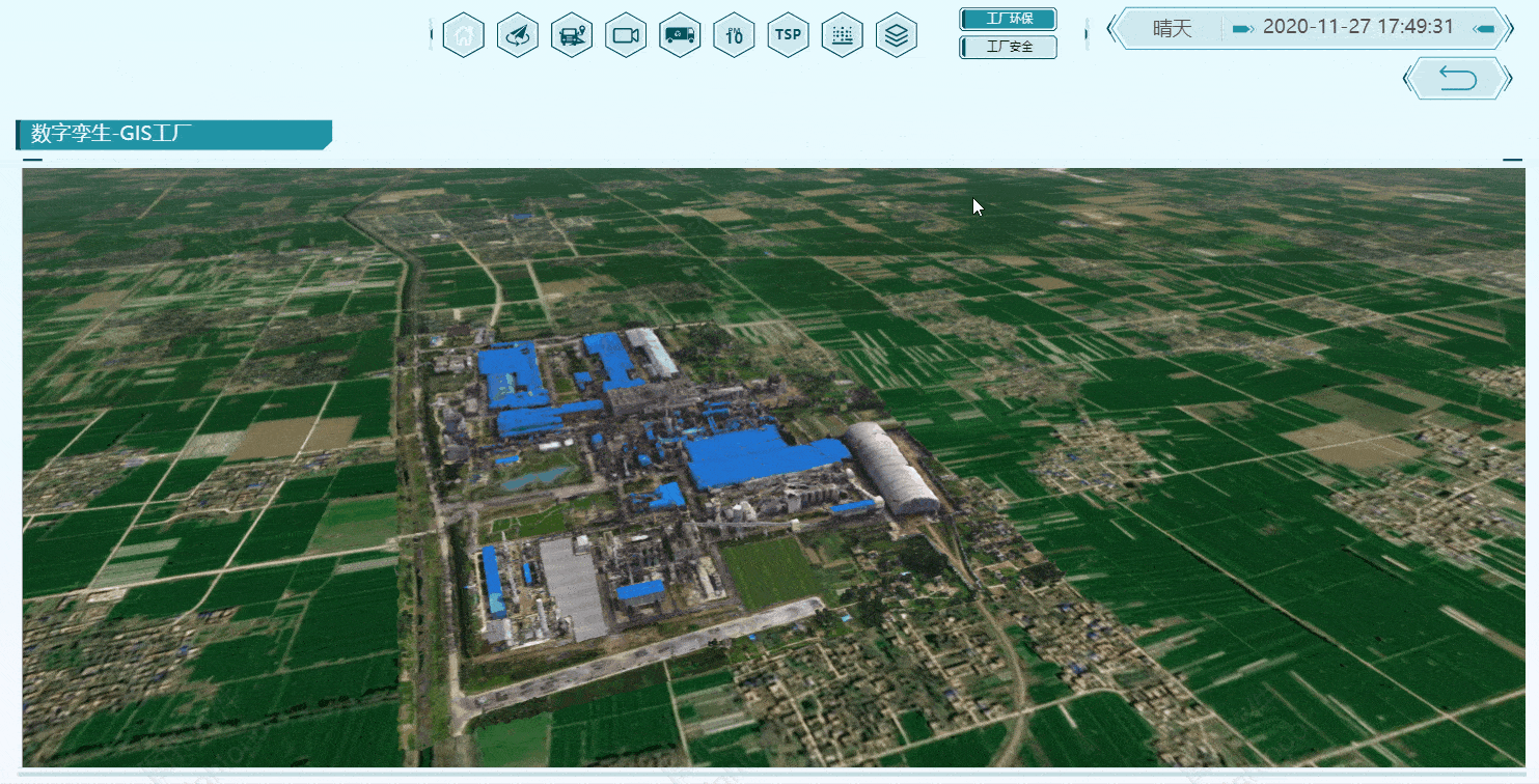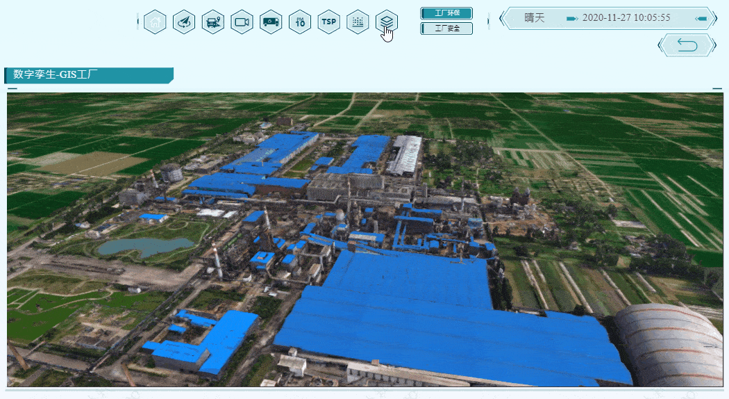 空间的数据分析是 GIS 的核心内容之一。对于数字钢厂,为了保护环境,主要分析 TSP、PM10、PM2.5、组织、工厂污染等。安全方面,主要是场景监测、消防设备和安全范围四色图。