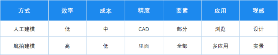 航空照片建模和人工建模的特性比较如下: