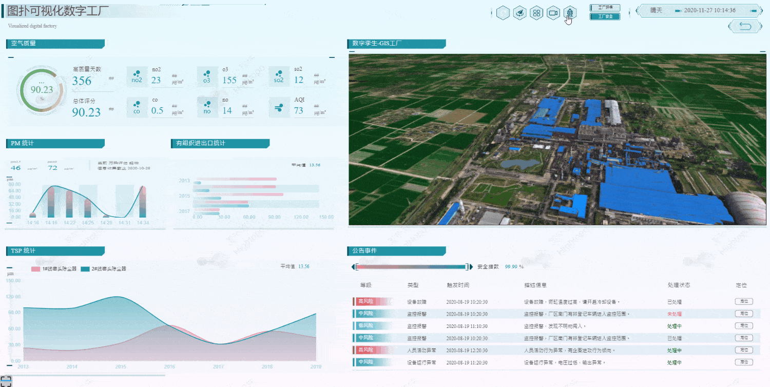 另一方面,数据可视化在一定程度上较过去的工作方式有多改变。例如工厂巡逻,职员不需要去现场。在可视化平台上可以通过漫游、视频监控等直接查看。结合物联网,工厂指标监测异常或警报时也可以进行控制处理。