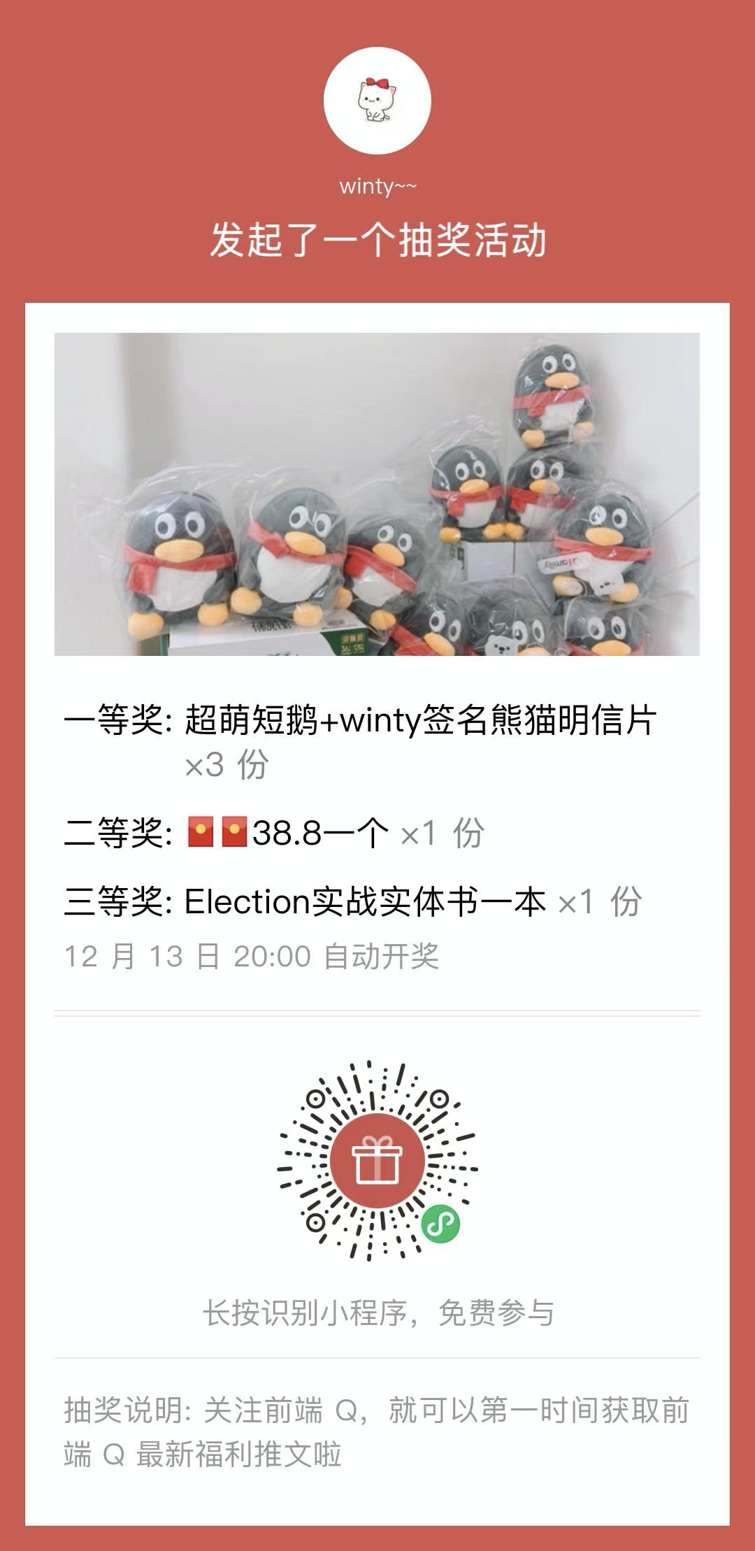 加群福利:若开奖后中奖的人在前端Q技术交流群则可另外获得随机红包一个~,扫下面的二维码回复 加群 即可加入技术群哦