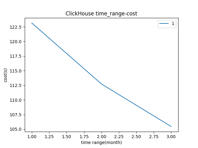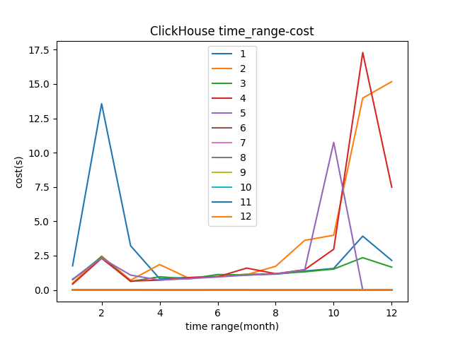 下图是ClickHouse的测试结果,x轴表示查询的时间范围,最大12个月,最小1个月,共测试12次。可以看到大部分耗时在3s内。