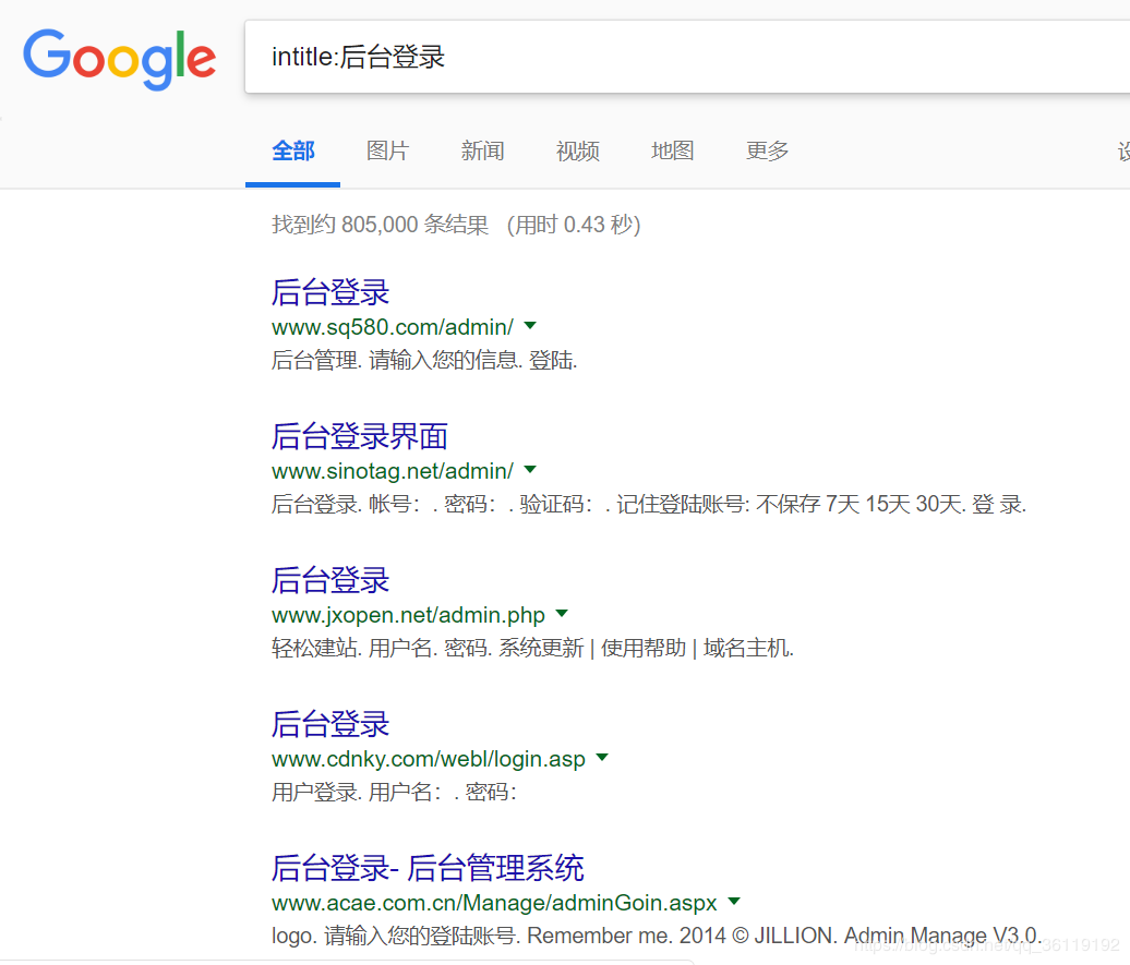 寻找标题中含有关键字的网页,例如: intitle:后台登录 将只返回标题中包含 后台登录 的网页,intitle:后台登录 密码 将返回标题中包含黑客而正文中包含中国的网页