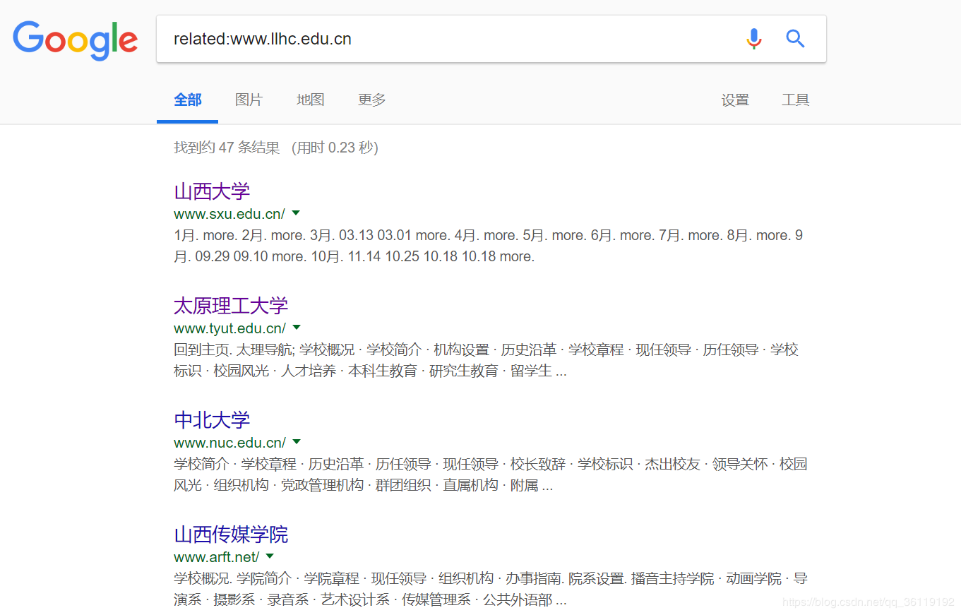 相似类型的网页,例如:related:www.llhc.edu.cn 将返回与 www.llhc.edu.cn 相似的页面,相似指的是网页的布局相似
