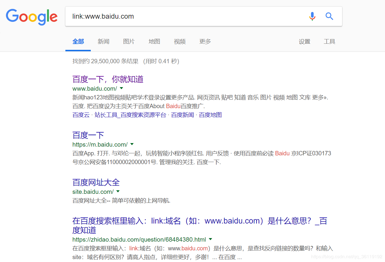 指定链接的网页,例如:link:www.baidu.com 将返回所有包含指向 www.baidu.com 的网页