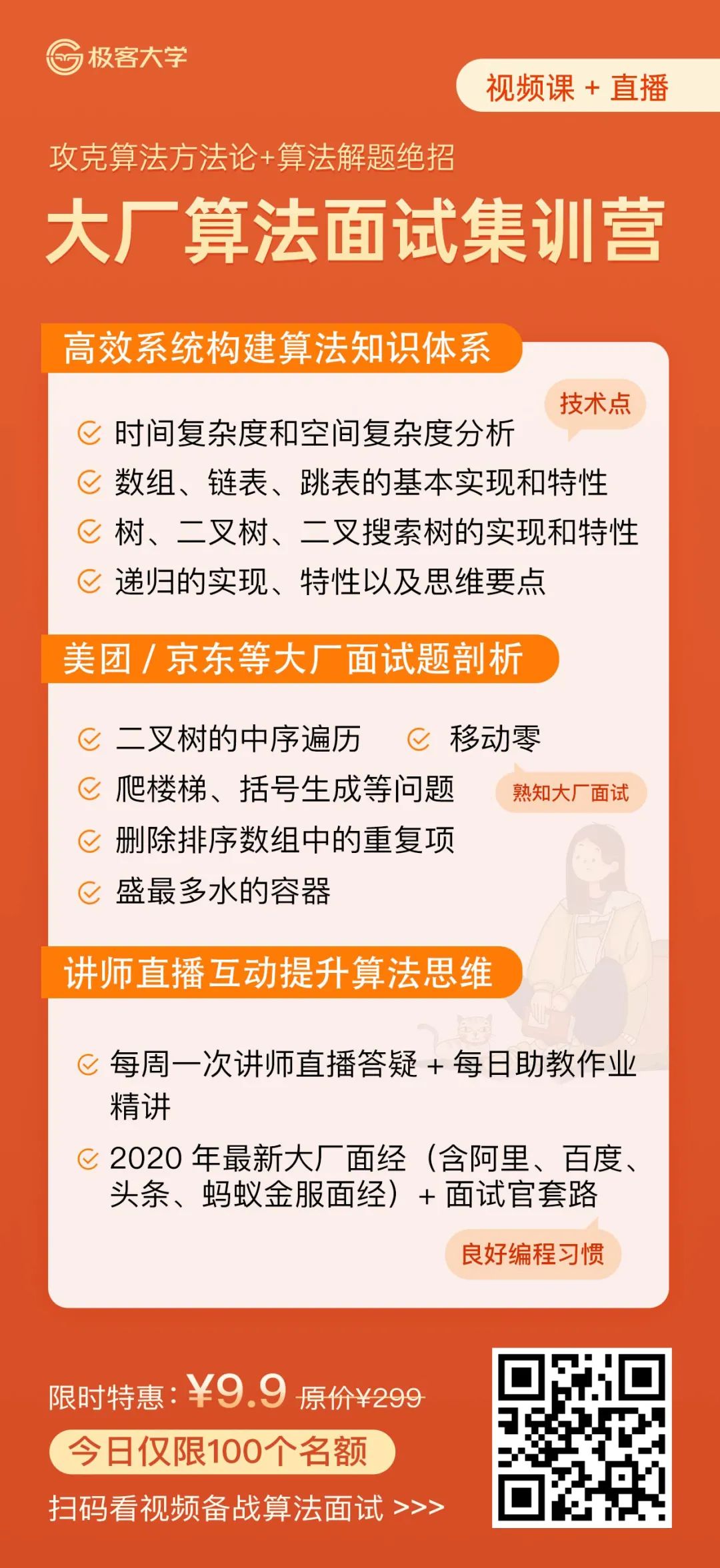其实算法学习也是有方法的,如果想要学好,必须要掌握正确的学习方法,建立自己的算法知识体系。极客时间的算法训练营正好有个体验课的活动,这里推荐给大家:讲师是前 Facebook 多年面试官覃超,会用 7 天带你掌握算法面试必考知识点,手把手带你了解企业的需求并接触到真实项目经验。建议算法根基不太稳的同学,仔细了解一下。