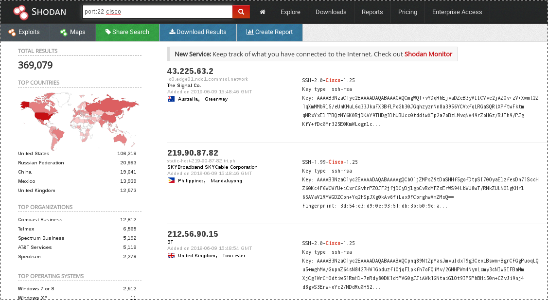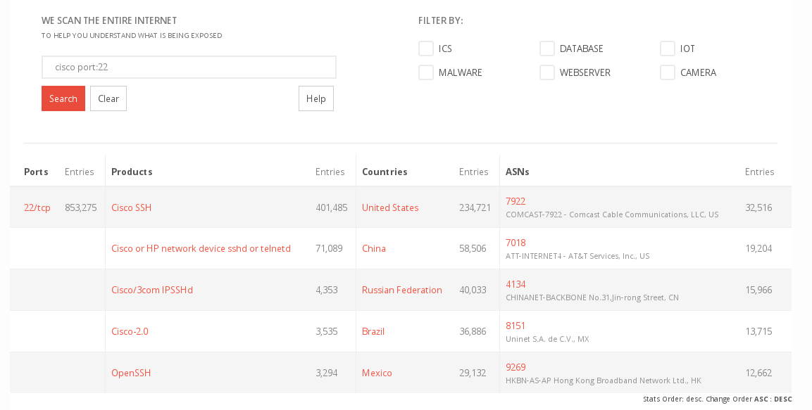 很长一段时间, shodan.io一枝独秀。虽然它很棒并且被广泛使用,但我意识到其后台发生了很多过滤。我记得大约两三年前,曝出了一个针对Cisco产品的RCE漏洞——虽然Shodan的日点击量很高,但一周后,搜索结果几乎为空。
