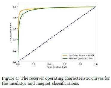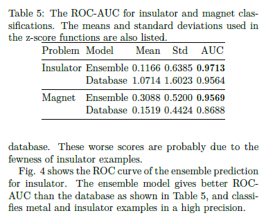 测试集中非磁体有 30,299 个,磁体有 25,629 个。非磁体组的总磁化率几乎为零,占检测组总磁化率的 54.2%,而磁性组的均值为 /atom,标准差为 /atom,最大值为 /atom。与带隙数据一样,全题磁化数据在零处非负偏置,但磁数据具有大于 1 的正偏度 1.66 和 4.72 的高峰度,表明具有重尾分布。金属绝缘体和非磁-磁材料分类结果如下: