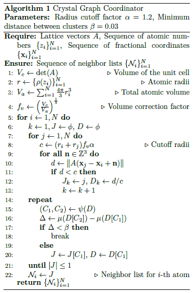 为了训练 CGNN 和 CG-Gen,框架需要一组由平衡结构组成的晶体图。在晶体学中,用泰森多边形找出原子的最近邻居,参考文献 [1] 运用了该方法。CGNN 引入了一种晶体图协调器,它通过聚类来连接原子间的原子间距。由于使用了体积校正因子和缩放距离,晶体图在单位单元的任何均匀变形下都具有不变性。伪代码如下图所示:
