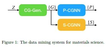 CGNN 框架如图 1 所示,CG-Gen 是原子序数的函数,会产生平衡结构下的晶体图 , 是有向边的集合 。P-CGNN 是一个预测平衡特性的多任务模型, 。S-CGNN 是在 条件下,推导出晶胞形状 和原子分数坐标 。本文通过预测的晶胞体积来缩放 来获得平衡晶胞 。
