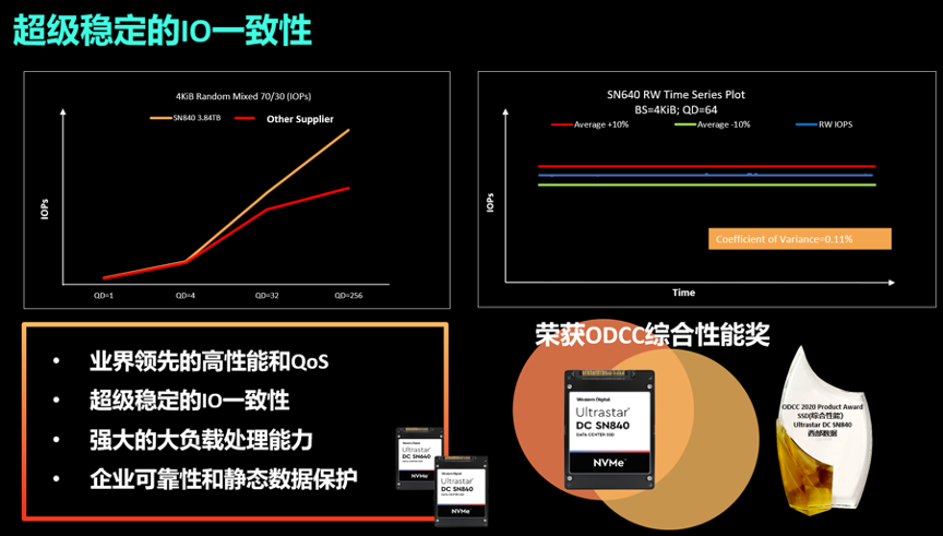 以西部数据Ultrastar DC NVMe SN640和SN840为例,其控制器中有两块芯片,分别处理前段FTL(Flash Transition Layer)和后端Flash Management。前端的FTL芯片包含多个独立的处理器,同时处理I/O输入输出及内部的后台优化工作;后端FM芯片也包含独立处理器多通道管理NAND FLASH。正因为如此,新款的西部数据Ultrastar DC SN840 NVMe SSD可以将性能波动控制在0.11%以内,其产品力不仅受到金融、运营商、互联网、云服务厂商的广泛青睐,更在今年ODCC上荣获了综合性能奖。