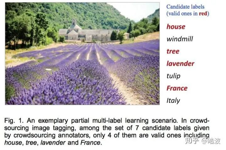 Partial Multi-Label Learning (PML):PML 是近年来多标签最新的方向,它考虑的是一类 “难以标注的问题”。比如,在我们标注下方的图片(Zhang et. al. 2020[5])的时候,诸如 Tree、Lavender 这些标签相对是比较简单的。但是有些标签到底有没有,是比较难以确定的,对于某些标注者,可能出现:“这张图片看起来是在法国拍的,好像也可能是意大利?”。这种情况称之为 Ambiguous。究其原因,一是有些物体确实难以辨识,第二可能是标注者不够专业(这种多标签的情况,标注者不太熟悉一些事物也很正常)。
