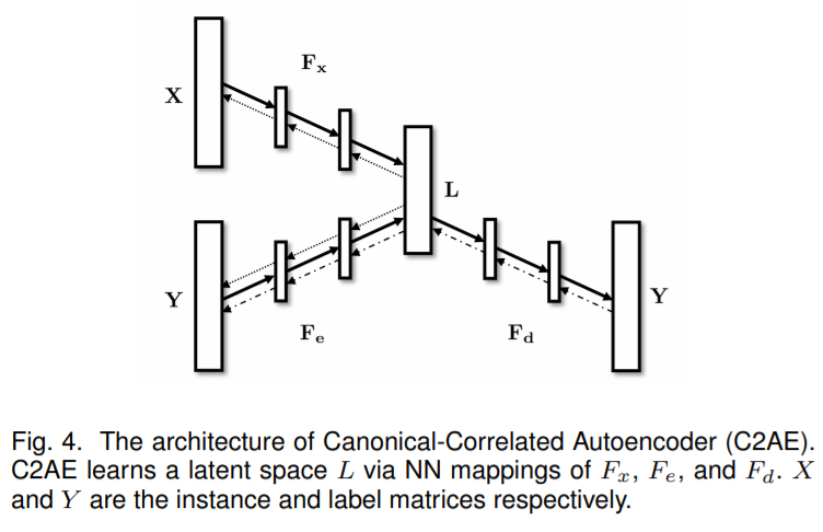 Deep Embedding Methods:早期的 Embedding 方法通常使用线性投影,将 PCA、Compressed Sensing 等方法引入多标签学习问题。一个很自然的问题是,线性投影真的能够很好地挖掘标签之间的相关关系吗?同时,在 SLEEC[3]的工作中也发现某些数据集并不符合 Low-Rank 假设。因此,在 2017 年的工作 C2AE [7] 中,Yeh 等将 Auto-Encoder 引入了多标签学习中。由于其简单易懂的架构,很快有许多工作 Follow 了该方法,如 DBPC [8] 等。