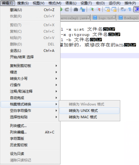 Notepad++ 中可以设置 Windows、Unix 和 Mac三种行尾换行符格式及其之间的转换,如下: