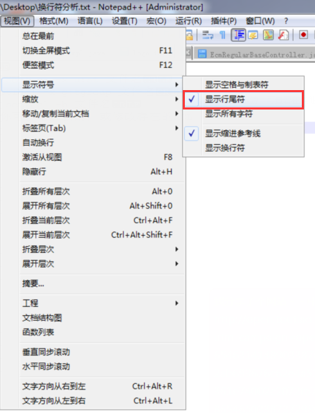 1)设置 Notepad++ 显示换行符,这样才能看到效果, 视图 -> 显示符号 -> 显示行尾符,如果是英文版的 Notepad++,则应该是 View -> Show Symbol -> Show End of Line;