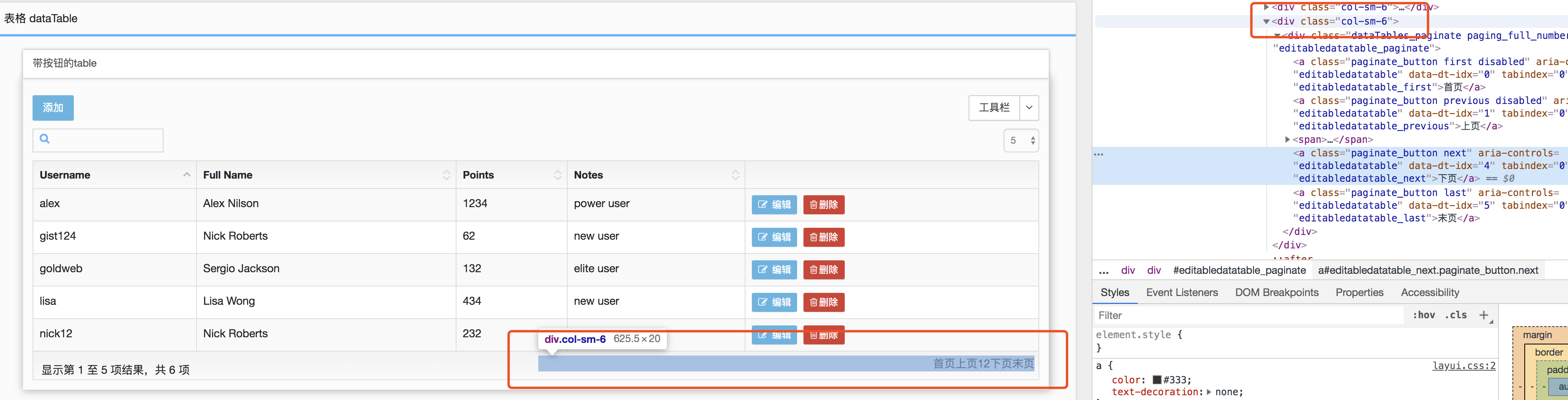有图可见 表单内生成了 两个col-sm-6 ,里面对应 i ,显示1到n项结果 ,p 对应 首页 尾页 内容