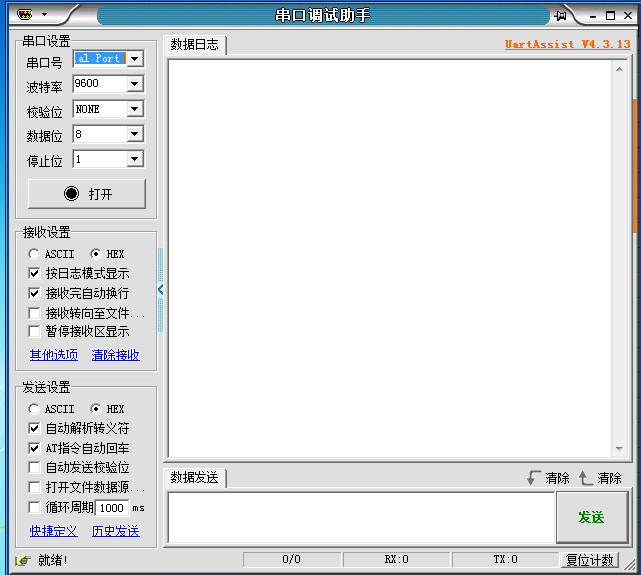 接收、发送设置不需额外配置,只需要选择接收/发送信息格式为ASCII码或HEX(16进制),“数据发送”窗口中应填入发送命令,将在“数据日志”窗口获得接收信息。