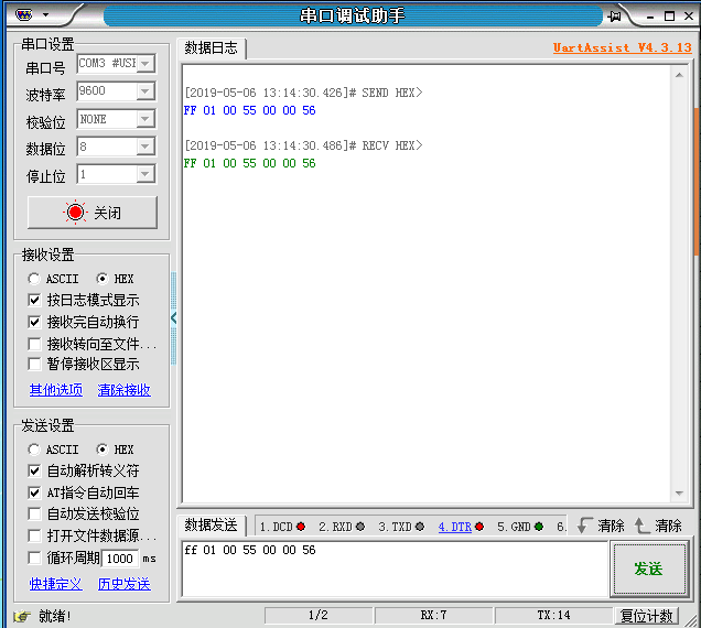 如上,界面较为简单,注意在使用前配置串口号、波特率、校验位、数据位、停止位等参数,与待控制的元件相关参数保持一致,点击“打开”按钮。(如图中所示串口号为COM3、波特率为9600等)