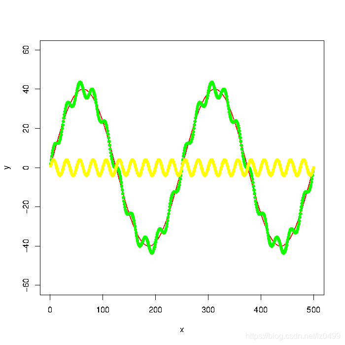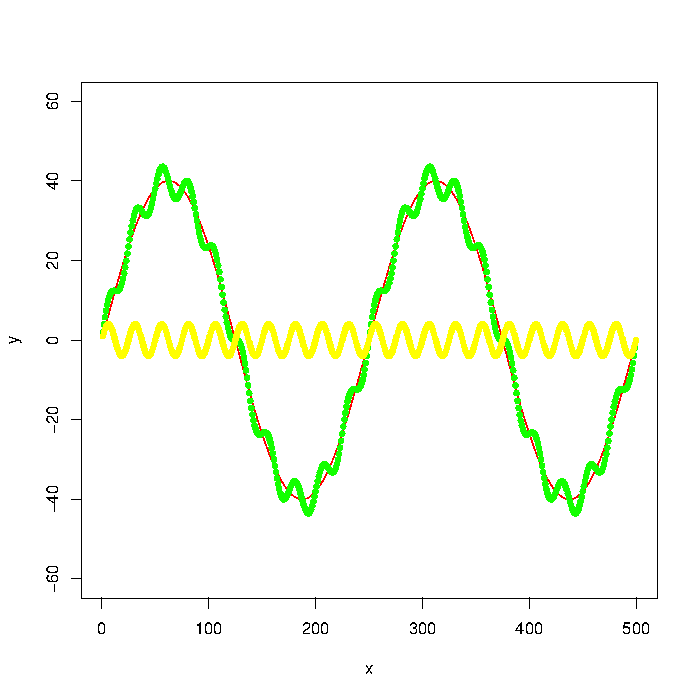 上图有三根曲线,黄线是高频波动,红线是低频波动。它们可以合成为一根曲线,就是绿线。