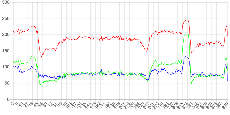 如果把每一行所有像素(上例是400个)的红、绿、蓝的值,依次画成三条曲线,就得到了下面的图形。