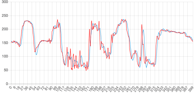 上图中,红线是原始的色彩曲线,蓝线是低通滤波后的曲线。