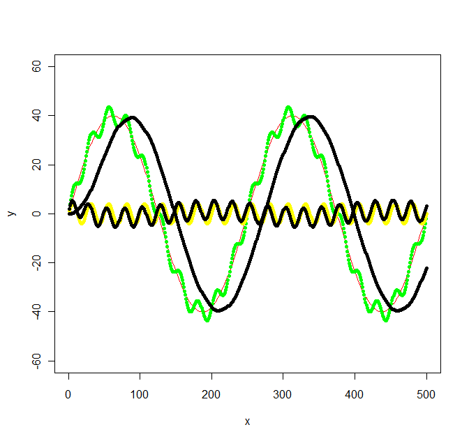 上图中,绿线进行低通滤波和高通滤波后,得到两根黑色的曲线,它们的波形跟原始的黄线和红线是完全一致的。