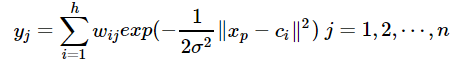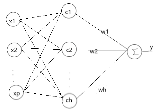 其中xp为第p个输入样本,ci为第i个中心点,h为隐含层的结点数,n是输出的样本数或分类数。径向基神经网络的结构可得到网络的输出为:
