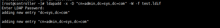 [root@localhost ~]# ldapadd -x -D "cn=admin,dc=sys,dc=com" -W -f test.ldif