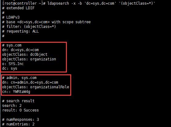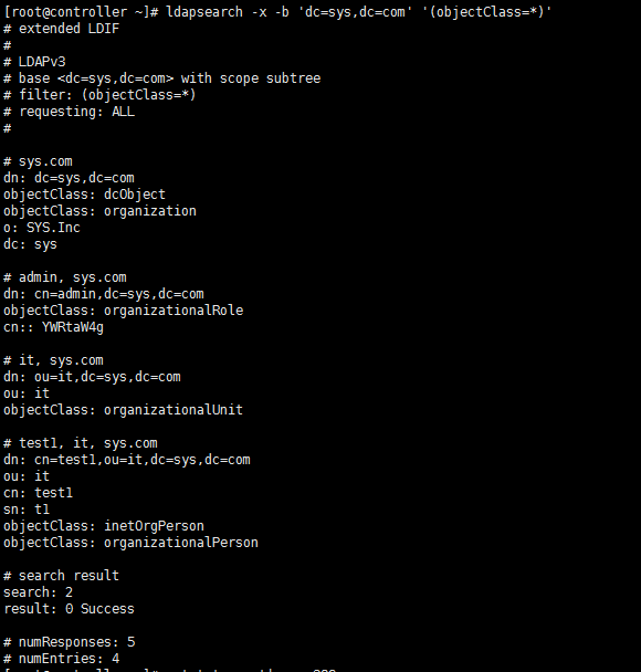 [root@localhost ~]# ldapsearch -x -b 'dc=sys,dc=com' '(objectClass=*)'