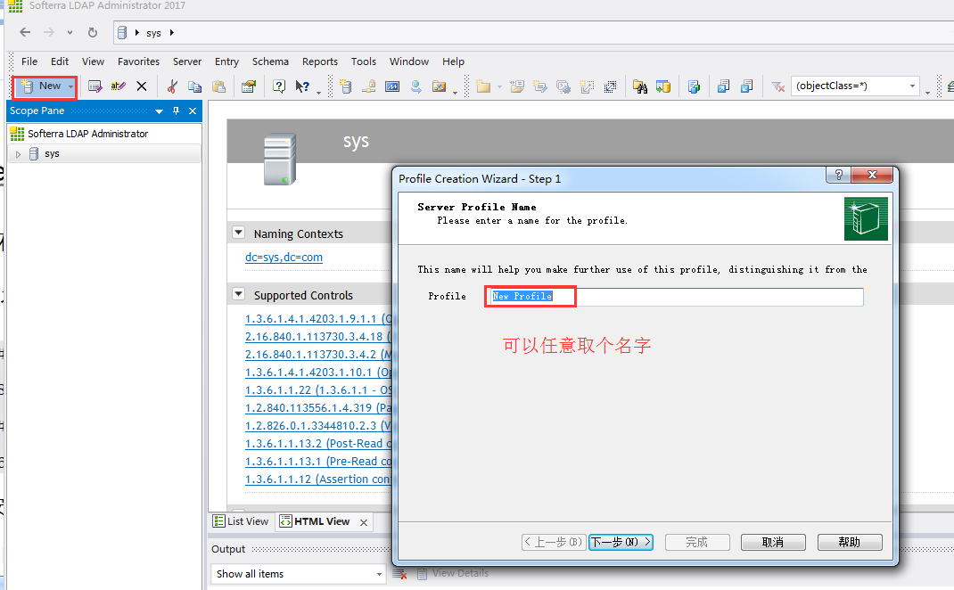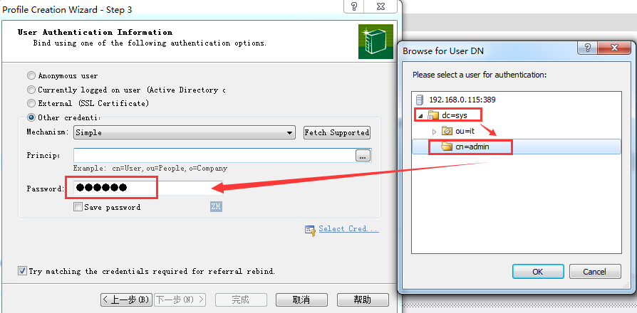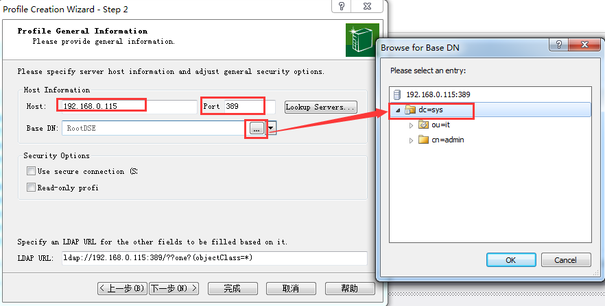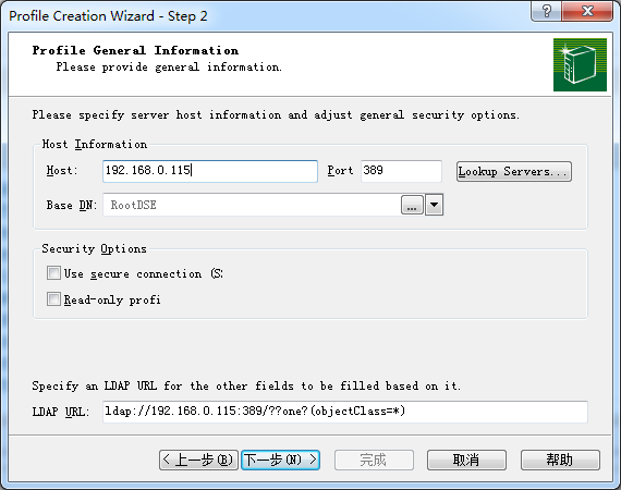BaseDN处默认为空,标示在根节点上,如果不想显示根节点,可在后方下拉列表中选择具体的一级数据库,下一步;