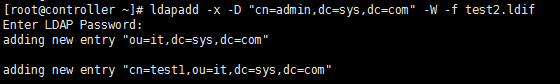 [root@localhost ~]# ldapadd -x -D "cn=admin,dc=sys,dc=com" -W -f test2.ldif