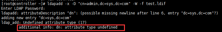 错误原因:test.ldif文件中dn之间没有空行,导致此错误。