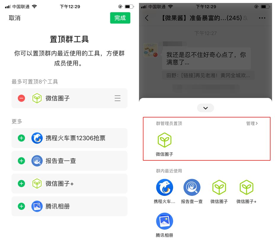 其中,群主和管理员可以选择置顶一些工具,最多可以置顶8个。