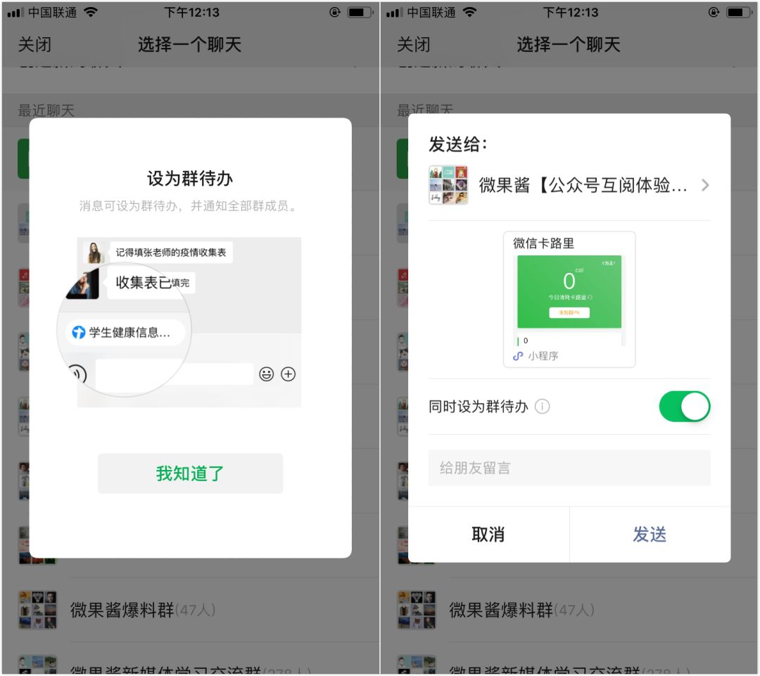 (3)群聊新增“已待办功能”。该功能只有群主和管理员才可以享有,在转发微信小程序时可将其设为“群待办”。