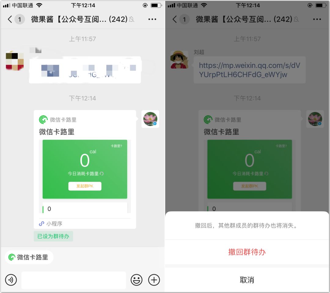 设置完成后的“群待办”消息将会一直显示在群聊天框的左下角,点击即可进入群主分享的小程序。另外,“群待办”与普通消息一样,也可以撤回。