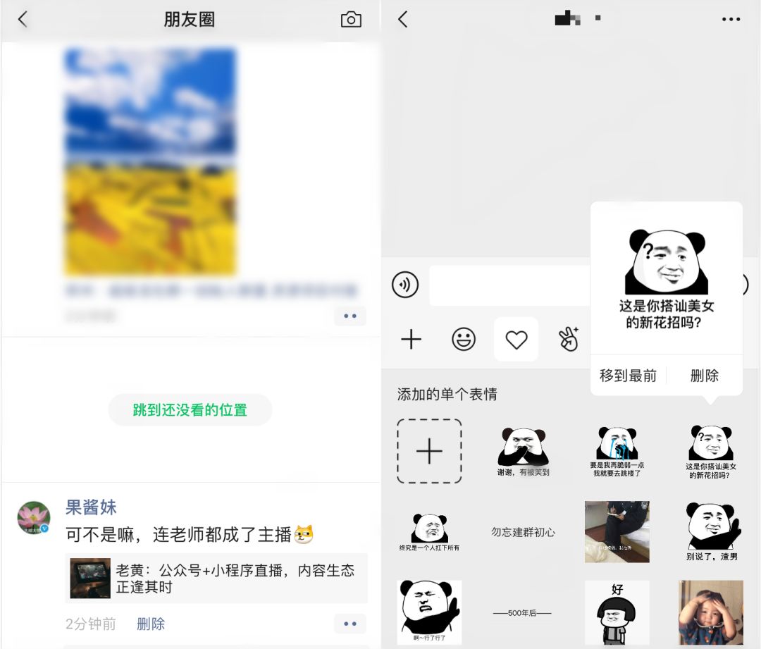 (5)聊天表情包库新增“移到最前”功能,长按表情包将出现“移到前面”和“删除”按钮,改变了以往只能从新到旧的排序原则。
