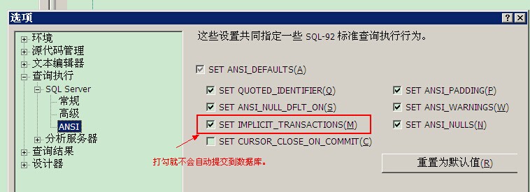 begin tran --开启事务 commit tran --提交事务 rollback tran --回滚事务 这样设置查询分析器后,不小update和delete错数据了,可以用 rollback tran --回滚事务 确定没有错误了,则 commit tran --提交事务 来源:oschina链接:https://my.oschina.net/u/162002/blog/263298 标签 误删除数据 mssql sql server