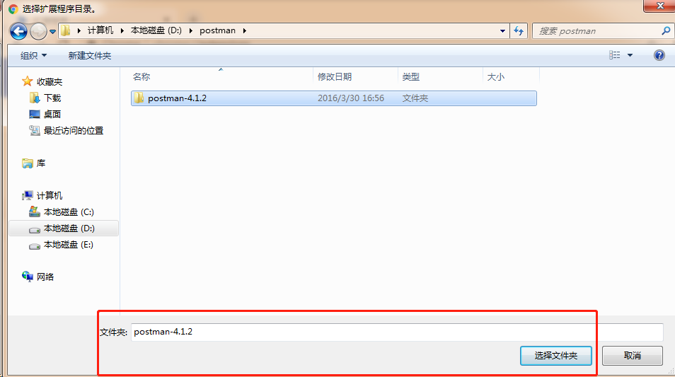 第三步:点击「加载已解压的扩展程序...」按钮,--------------》解压后的安装包路径下(本人的解压路径是:D:\postman\postman-4.1.2)---------》选择文件夹