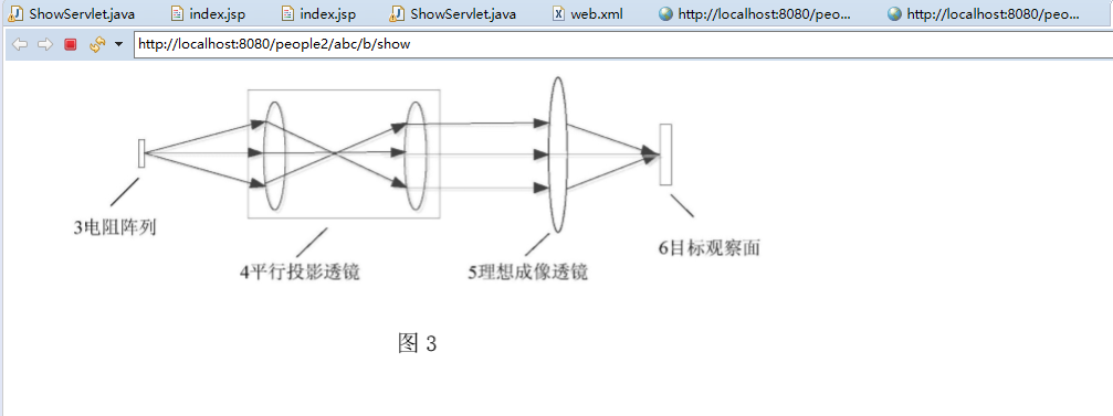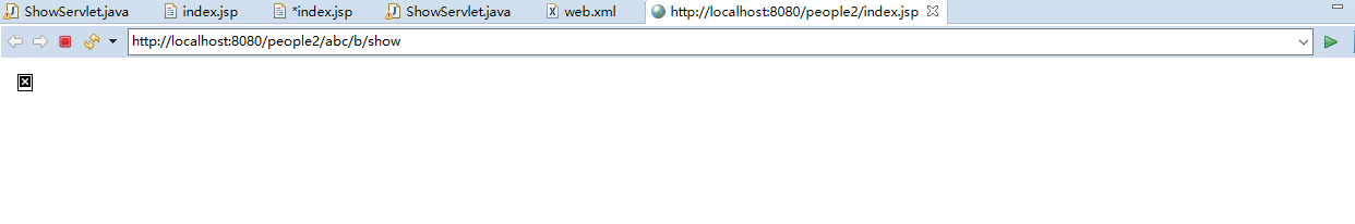 - 之前的ShowServlet请求转发至index.jsp,在jsp中显示图片<img src="image/a.png"/>,使用相对路径,此时显示失败,原因是jsp中如果使用相对路径,需要按照控制器的路径(ShowServlet)去找其他资源,而控制器中有虚拟的文件目录abc/b/,浏览器就会在abc/b/下寻找image文件夹,所以无法寻找到图片。