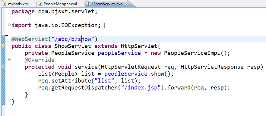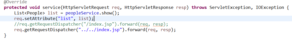 - 例如,在ShowServlet中请求转发到index.jsp,因为在注解WebServlet中配置Servlet时定义了("/abc/b/show"),也就是在WebContent下映射了一个虚拟文件夹abc,abc文件夹下有一个虚拟文件夹b,文件夹b下有资源show,而此时index.jsp在WebContent下。请求转发如果使用相对路径,则应写为"../../index.jsp",而这就非常复杂,而如果使用绝对路径,就可写为"/index.jsp",这样不会出错。