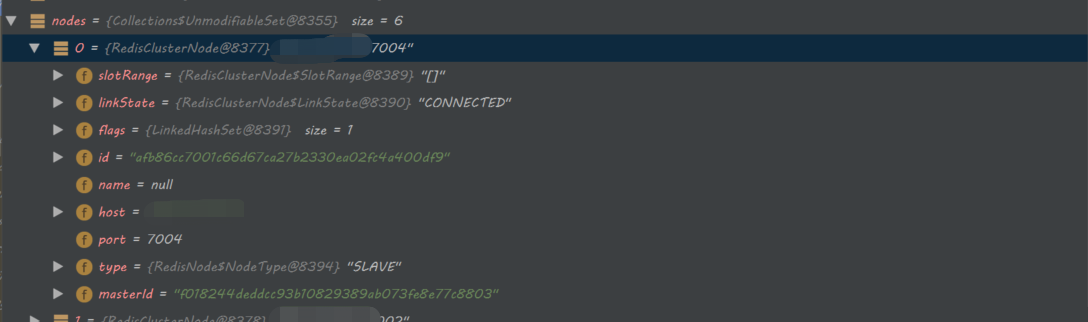 一、通过RedisClusterConnection.clusterGetNodes 构造获得的是一个集合,不过是无序的,要什么信息可以自己获取,下面图片仅供参考