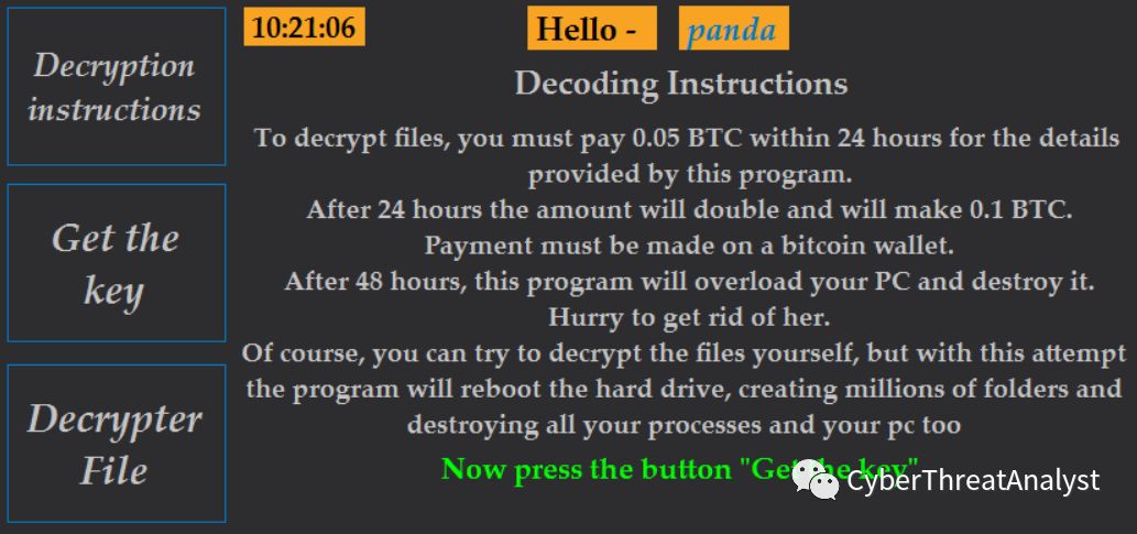 下载Decrypt.exe解密程序到C:\用户名\Decrypter.exe和C:\Users\用户名\Desktop\Decrypter.exe两个目录下,然后启动C:\用户名\Decrypter.exe 解密程序,如下所示: