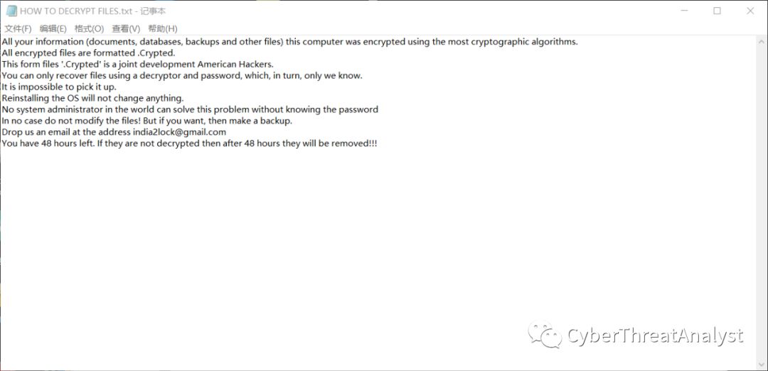 最近一款新型的勒索病毒强势来袭,对捕获到的样本进行了详细分析,勒索病毒运行之后,勒索信息文本文件,如下所示: