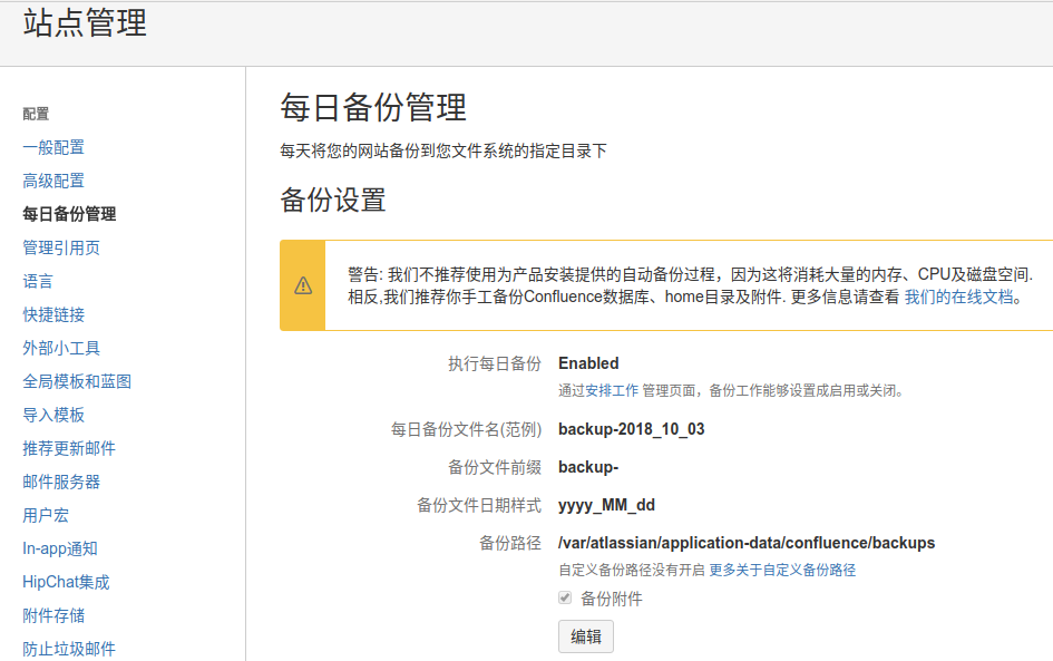 默认每天会自动备份一个zip打包的数据,存放在服务器的/var/atlassian/application-data/confluence/backups路径下。还可以点击"编辑"进行自定义。