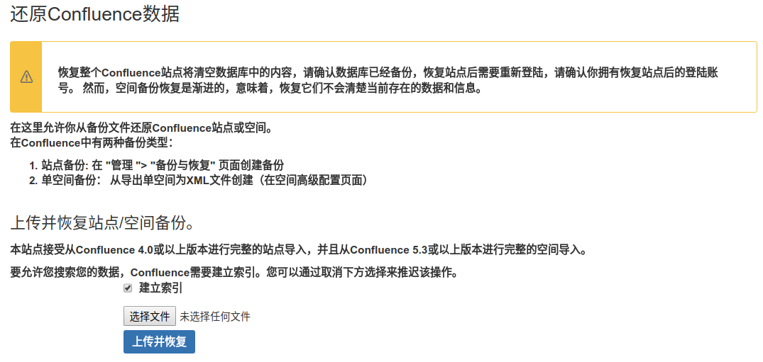 - 如果此空间不存在,则可以如同上面方法恢复数据:即将备份在/var/atlassian/application-data/confluence/temp/里面的数据拿到本地,然后点击"上传和恢复"即可进行数据恢复。