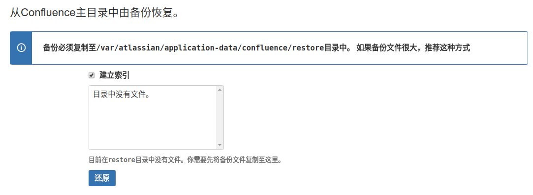 当备份数据比较大时,可以将备份数据拷贝到/var/atlassian/application-data/confluence/restore路径下,从Confluence主目录中进行恢复。如下: